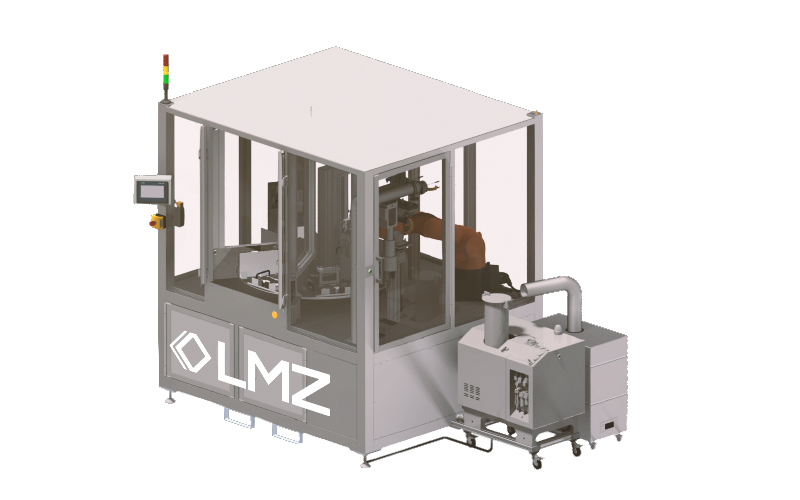 Die 465-Klebeanlage von LMZ realisiert die teilautomatische, prozesssichere Montage von zwei Kunststoffbauteilen. Der integrierte KUKA-Roboter greift ein Bauteil vom Rundtakttisch, und bewegt es entlang einer Klebedüse, sodass das Bauteil mit seinem Gegenstück zusammengesetzt und verpresst werden kann.